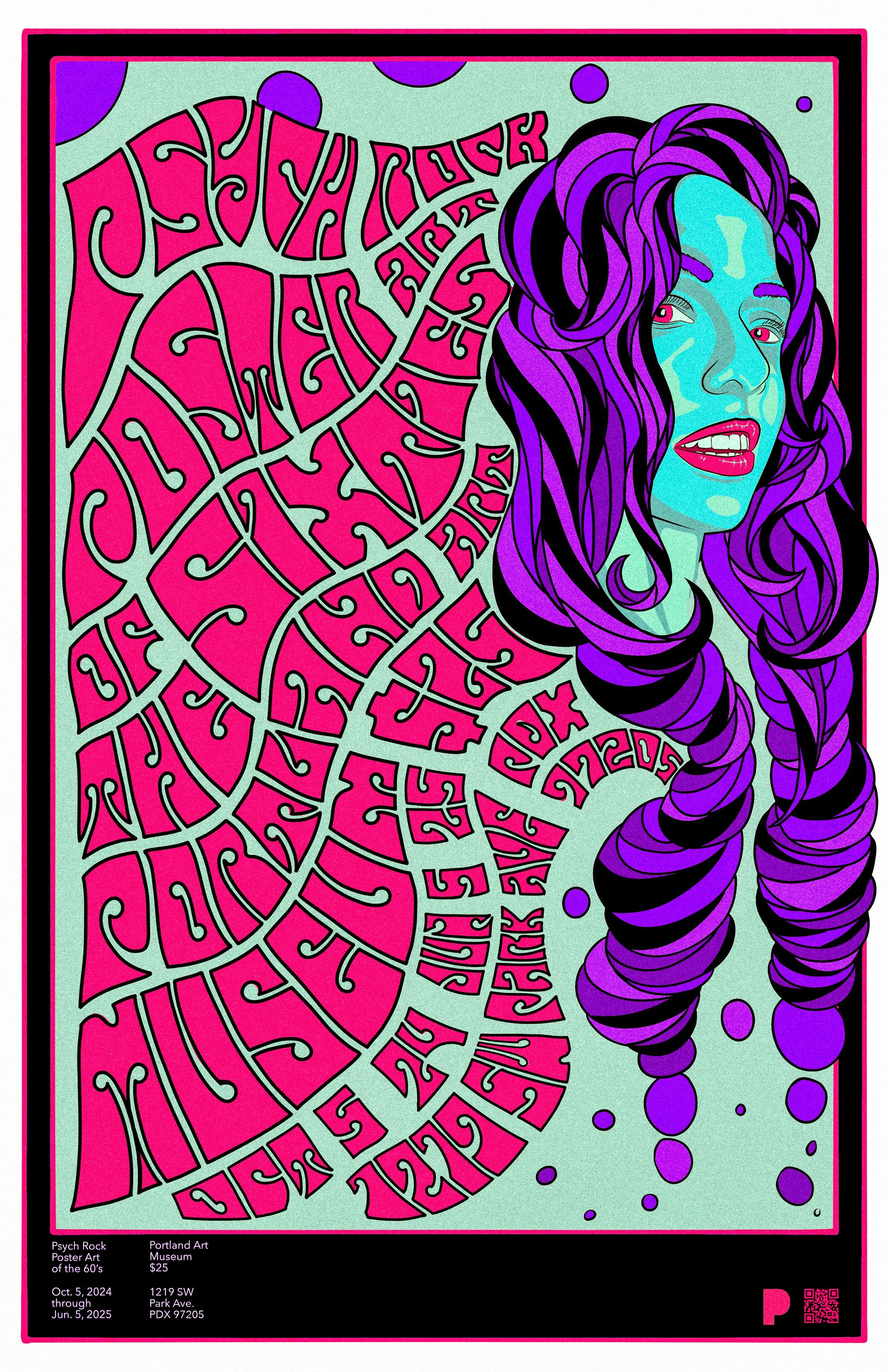 I was asked to make a poster for the Portland Art Museum “Psychedelic Rock Poster Art of the 60s” exhibit. I dove into the art of the era. I was inspired by the artists who used vibrant color, fluid typography, and surreal portraiture to draw viewers into the piece. It really encouraged people to engage with the elements. I wound up drawing and designing it all by hand first, then translated it into a digital form.